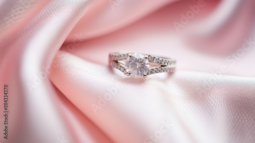 Obraz premium Jewellery, proposal and holiday gift, diamond engagement ring on pink silk...