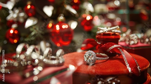 Fototapeta premium Jewelry store s winter holiday sale with Christmas tree ribbon and engagement...