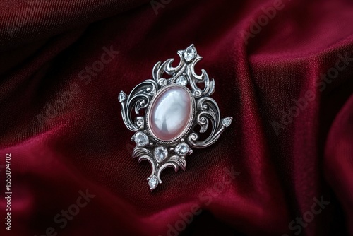 © elenaed, Fototapeta premium Jewelry with gemstones luxury silver brooch with Milky Quartz on a burgundy background