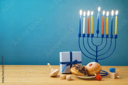 Naklejka premium Jewish holiday Hanukkah background with menorah, sufganiyot, gift box and spinning top on wooden table