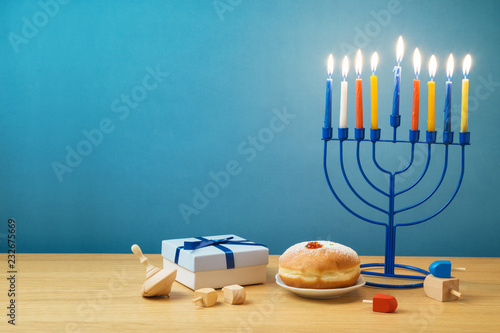 Naklejka premium Jewish holiday Hanukkah background with menorah, sufganiyot, gift box and spinning top on wooden table