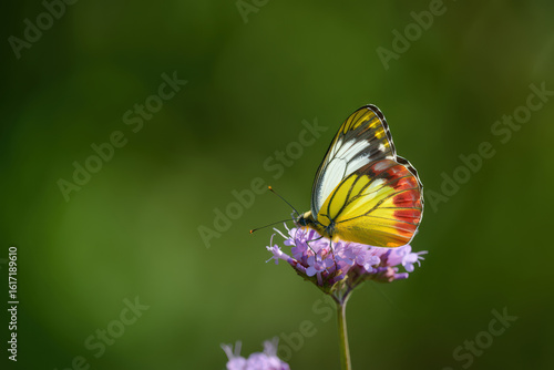 © Mst, Naklejka premium Jezebel Butterfly Perched on Purple Verbena Flowers, Displaying its Striking Yellow, Red, and White Wings Against a Soft Green Background in a Natural Setting