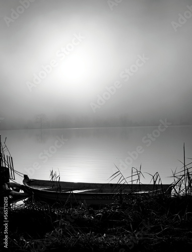 © artur, Obraz premium Jezioro i stara łódka, mocna ekspozycja przez światło słoneczne