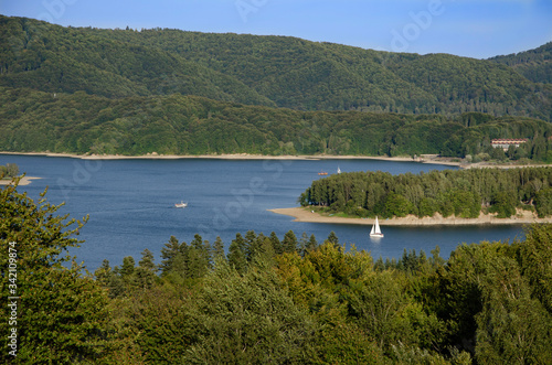 Fototapeta premium jezioro nad soliną i zielone wzgórza