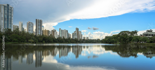 Naklejka premium Jezioro odbijające się w wodzie, mieście i błękitnym niebie. Brzegi jeziora Igapo w Londrinie, PR, Brazylia.