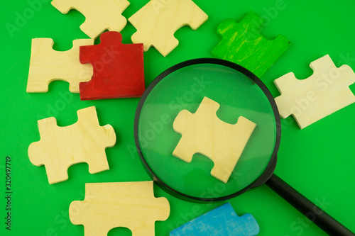 Fototapeta premium Jigsaw puzzle pieces with magnifying glass