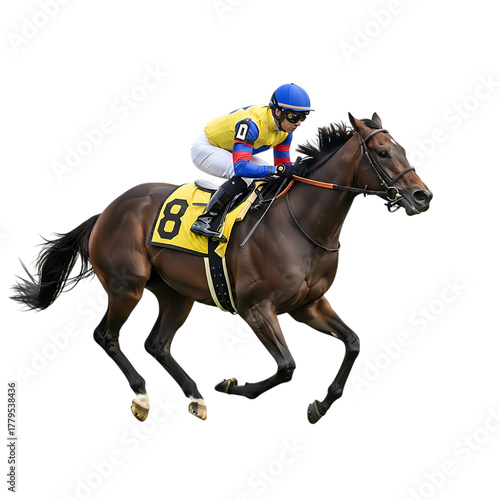 Fototapeta premium Jockey in yellow blue and white racing silks riding a brown horse with yellow saddle cloth number 8, cutout, PNG isolated on white or transparent background
