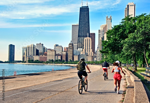© Jim Glab, Fototapeta premium Jogger and cyclists in Chicago along the Lake Michigan shoreline
