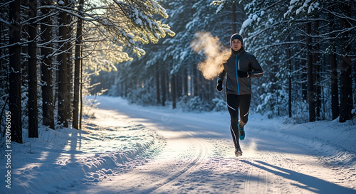 Naklejka premium Jogger in winter gear athletic man jogging on snowy forest road in cold weather, visible breath in frosty air, wearing thermal running clothes, concept of healthy lifestyle, endurance and motivation