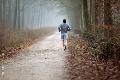 Fototapeta premium Jogger on a Foggy Forest Trail: Solitude, Fitness, and Natural Beauty in a Serene Landscape