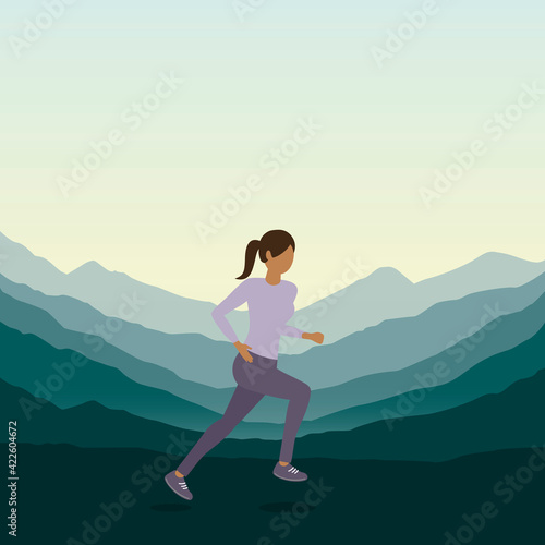 © krissikunterbunt, Obraz premium jogging sporty girl on green mountain landscape