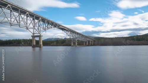 © Scalia Media, Fototapeta premium Johnsons Crossing, Teslin River steel Bridge on the Alaska Highway during spring summer time with cloudy, blue sky day and magnificent, huge structure over the flowing water below.