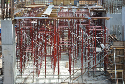 © Aisyaqilumar, Obraz premium JOHOR, MALAYSIA -APRIL 13, 2016: Scaffolding used as the temporary structure to support platform, form work and structure at the construction site. Also used it as a walking platform for workers.