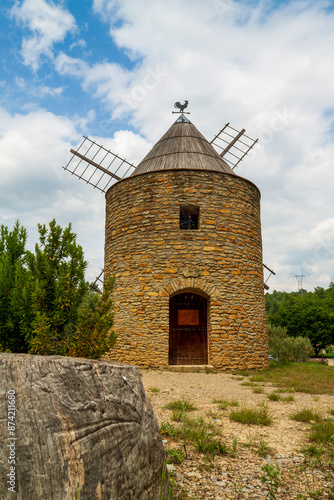 © JulieMeneghin, Fototapeta premium Joli moulin provençal, champ d'oliviers et ciel bleu