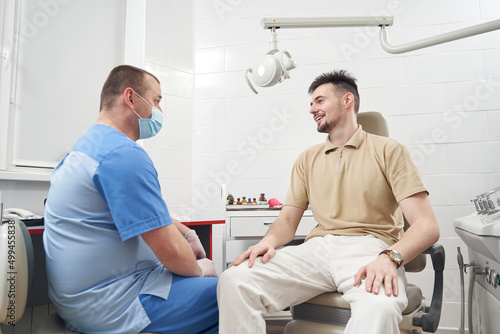 © Svitlana, Obraz premium Jolly man visiting doctor office and communicating with him
