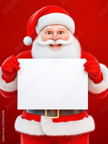 © tea, Naklejka premium Jolly Santa Claus Holding a Sign - Cheerful Santa Claus holds a blank sign, symbolizing Christmas wishes, holiday greetings, festive announcements, promotional offers, and seasonal joy