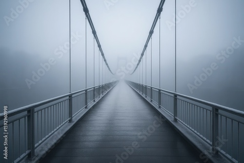 Obraz premium Journey into the Unknown: A desolate suspension bridge disappears into thick,...
