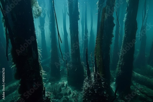 © ManusiaIkan, Fototapeta premium Journey through a submerged cathedral of trees, where towering trunks reach towards the surface, creating an awe-inspiring underwater, Generative AI