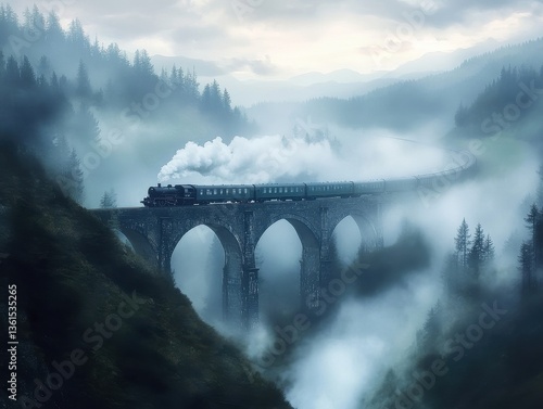 © Tengkwa, Fototapeta premium Journey Through Fog: A classic train journeys across a stone bridge shrouded in mist, traversing a mountainous landscape, evoking a sense of mystery and adventure.