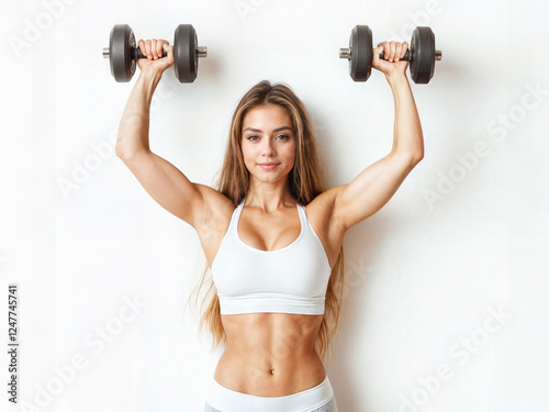 © Dudarte, Fototapeta premium Jovem fitness exibindo braços definidos ao levantar alteres em fundo branco, imagem inspiradora e focada em saúde e condicionamento físico.