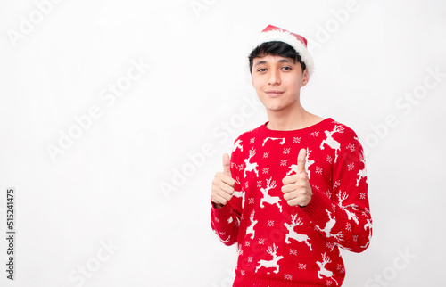 © Paul, Fototapeta premium Joven Hombre caucasico con los pulgares arriba vestido con ropa navideña en un fondo blanco aislado