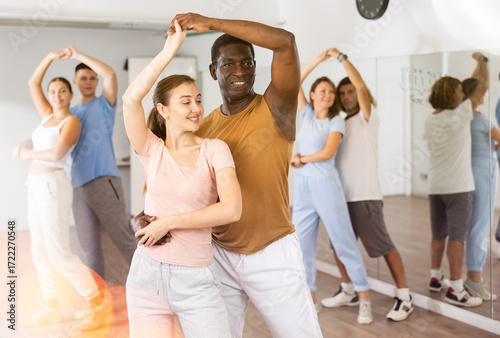Naklejka premium Joyful active adult men and women learning to dance in pairs in modern choreographic studio, indoors