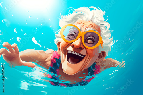 © YuTphotograph, Fototapeta premium Joyful active old woman in the pool