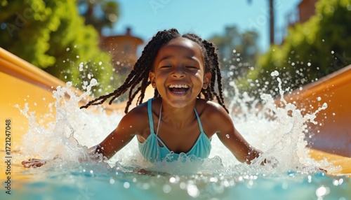 © Vadym, Obraz premium Joyful African American girl with braided black hair speeds down yellow waterslide at waterpark. Laughs exuberantly, splashing water as enjoys carefree summer day. Water sprays around as experiences