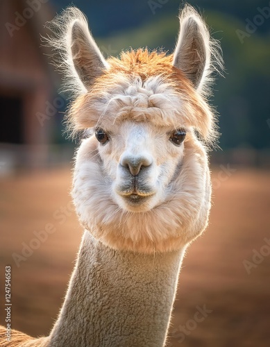 © Matthias, Obraz premium Joyful alpaca gazes at the viewer with an inquisitive expression, surrounded by a peaceful farm environment and soft evening light, showcasing its fluffy wool and charming personality