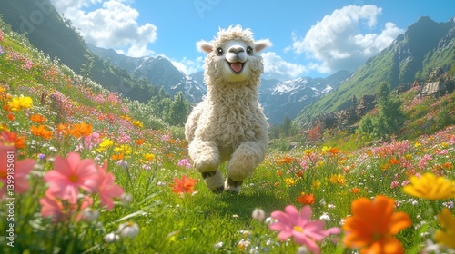 © Muamanah, Obraz premium Joyful Alpaca in a Blooming Mountain Meadow