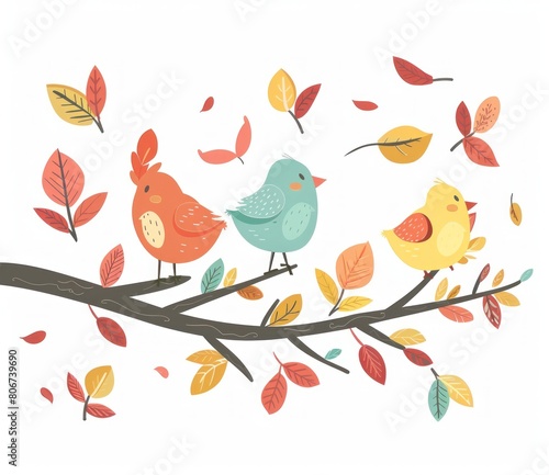 © Gelpi, Naklejka premium Joyful Birds Chatter on a Branch with Autumn Leaves Drifting - Generative AI