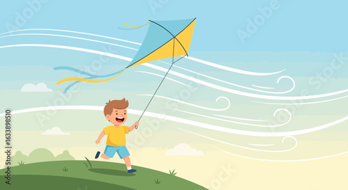 © Muthia, Fototapeta premium Joyful Boy Running With Kite Against A Windy Sky On A Sunny Day