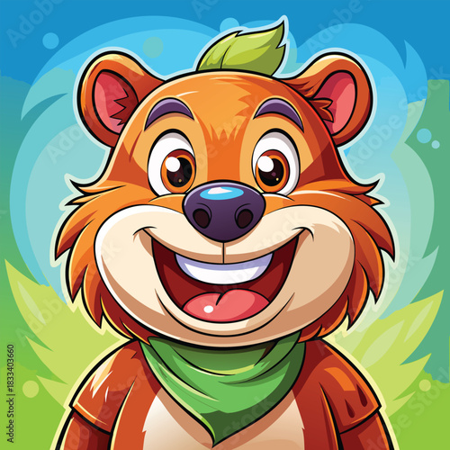 Obraz premium Joyful cartoon bear character with green scarf and leaf