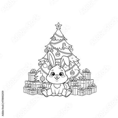 © Tapan, Fototapeta premium Joyful Cartoon Bunny Celebrating Christmas with Decorated Tree and Presents Coloring Page