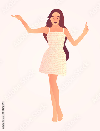 Naklejka premium Joyful Celebration; A Woman Embracing Happiness, a woman wearing a white dress, posing confidently, full body shot, illustration, vibrant colors, digital art, elegant, glamorous