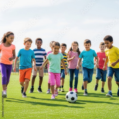 © Ophelia, Naklejka premium Joyful celebration of children’s day with kids playing soccer outdoors