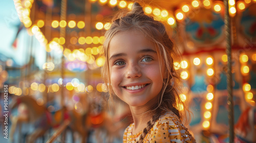 © Katerina Bond, Obraz premium Joyful child in an amusement park, smiling against the background rotating carousel, cheerful colorful atmosphere, carefree childhood.