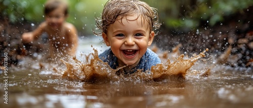 © raja, Obraz premium Joyful Child Splashing in a Muddy Puddle