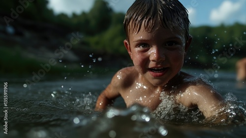 © SATRIANANGISAN, Fototapeta premium Joyful child splashing in river