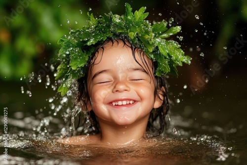 © kvladimirv, Fototapeta premium Joyful Child with Leafy Crown Enjoys Nature in Refreshing Water Splash
