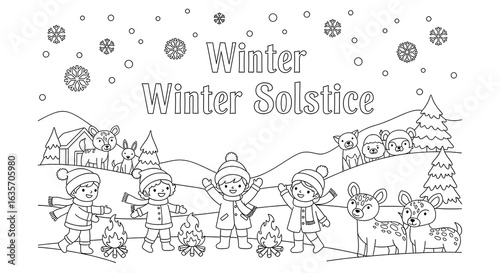 Fototapeta premium Joyful Children and Animals Celebrate Winter Solstice: Line Art Coloring Page