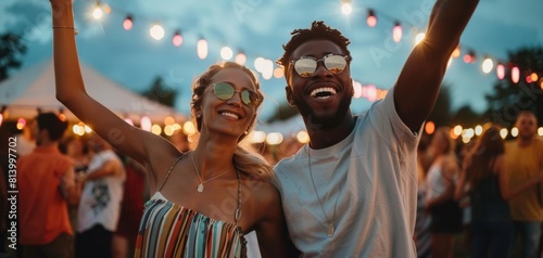 © MOMO, Obraz premium Joyful Couple Celebrating at a Festive Outdoor Event.