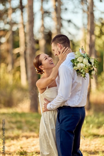 © bnenin, Fototapeta premium Joyful Couple Embraces in Nature Setting Holding Flowers on Their Wedding Day