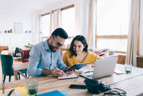 © BullRun, Fototapeta premium Joyful couple taking notes and using gadgets