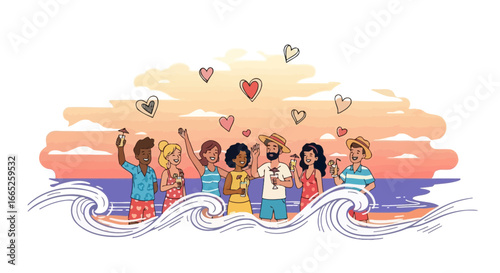 Fototapeta premium Joyful Diverse Group Enjoying Beach Vacation with Cocktails and Heart Embellishments