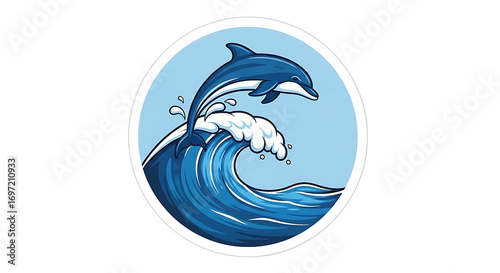 © Hamza, Naklejka premium Joyful dolphin leaps through a cresting ocean wave under a clear blue sky.