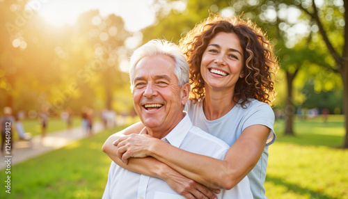 Fototapeta premium Joyful embrace between smiling adults in sunny park, connection and happiness