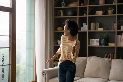 Fototapeta premium Joyful excited African American girl having fun, enjoying fitness activity, exercises at home, dancing, laughing, singing along to music on radio. Young homeowner woman celebrating good event