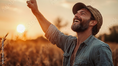 © Worakit, Obraz premium joyful farmer celebrating successful harvest in golden field at sunset
