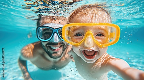 Naklejka premium Joyful father and son swimming together in clear pool bright outdoor setting